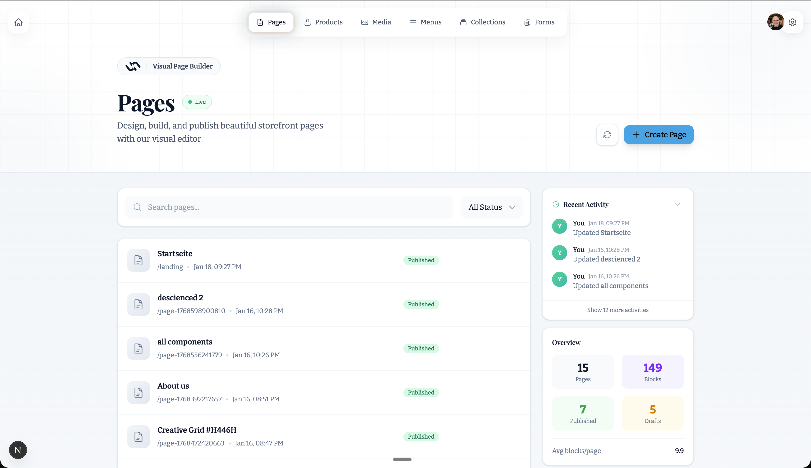 Page Builder: Drag-and-drop editing with real-time preview and inline text editing