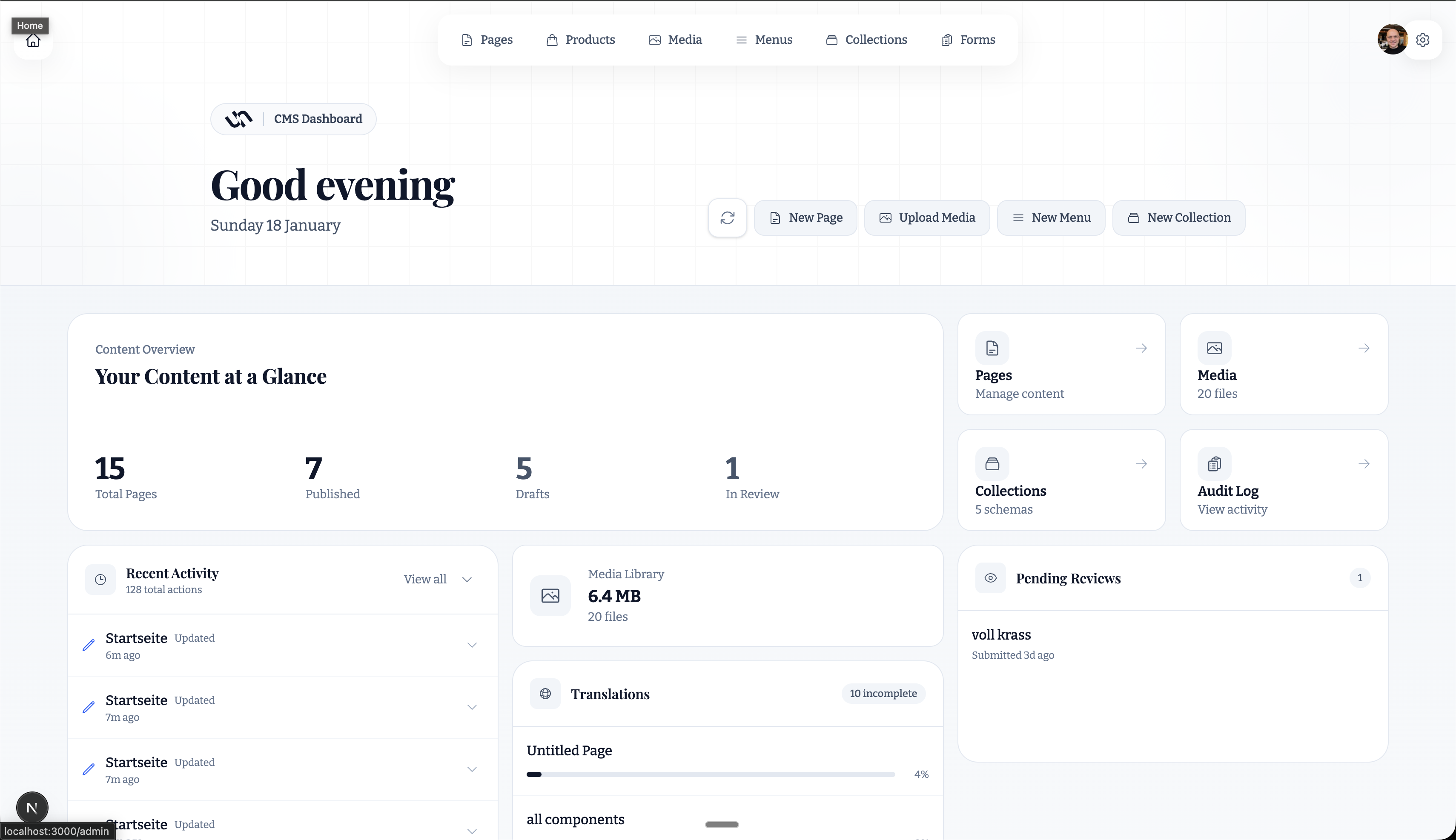 Dashboard: Your content at a glance with activity feed, stats, and quick actions